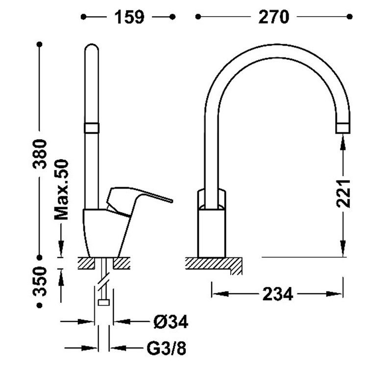 Grifo monomando para cocinaCon latiguillos de alimentación flexibles G3/8. Grifo monomando de cocina de la marca TRES, una de las marcas más importantes de Europa en el mercado de grifería, con vocación de calidad de producto y servicio. Sistema Tres-Duo de doble apertura (en la posición intermedia, consume la mitad de agua).Ángulo de giro del caño 360º.