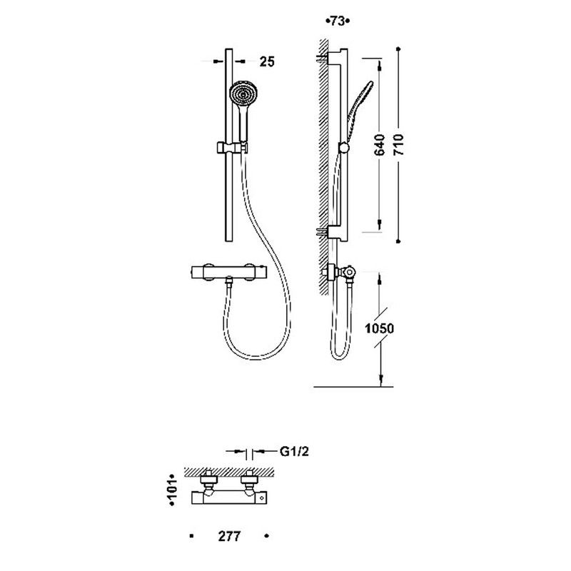 Kit de grifo termostático mural para ducha· Barra de ducha: long. 640 mm.· Soporte deslizante y orientable para ducha de mano.· Ducha de mano anticalcárea: Ø 100 mm.· Flexo metálico. Grifo de la marca TRES, una de las marcas más importantes de Europa en el mercado de grifería, con vocación de calidad de producto y servicio. Este grifo es de la serie BASE PLUS, de gama básica. Se caracteriza por sus líneas simples y adaptables a cualquier ambiente. Tiene aspecto minimalista y mando ergonómico y cuerpo con líneas sinuosas, agradables y claras. Permite equipar el baño con los elementos esenciales.