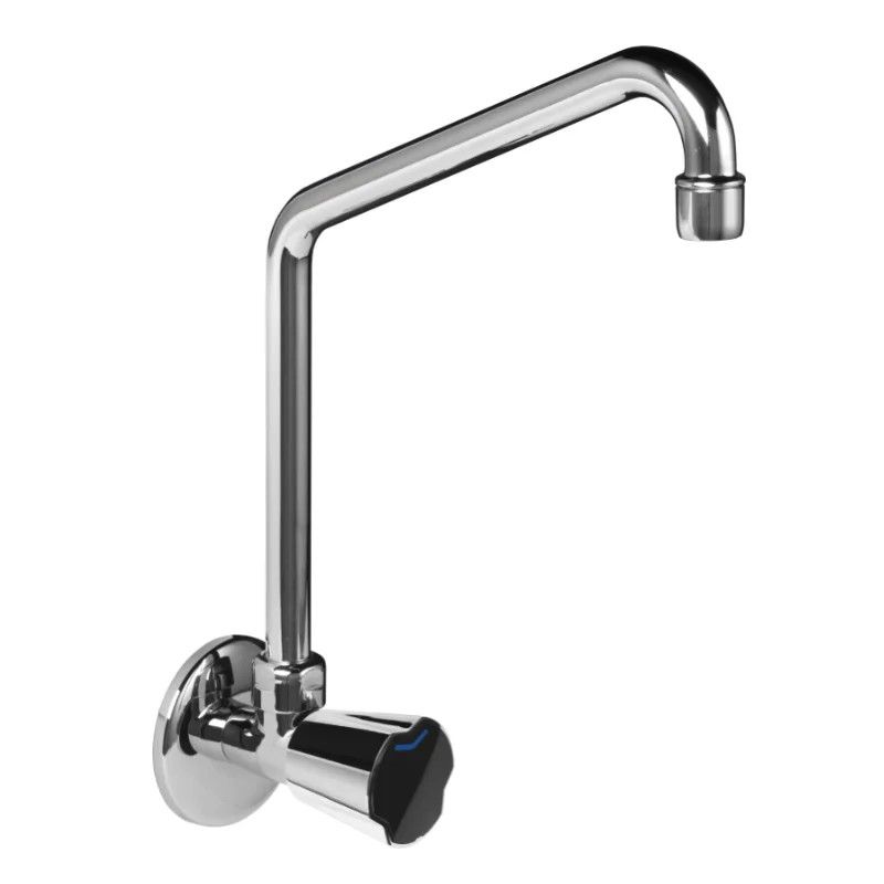 Grifo mural para conexión a pared de 1/2" de una sola agua, con caño superior muy alto. El caño es un poco más corto de lo habitual. El grifo tiene montura estándar.