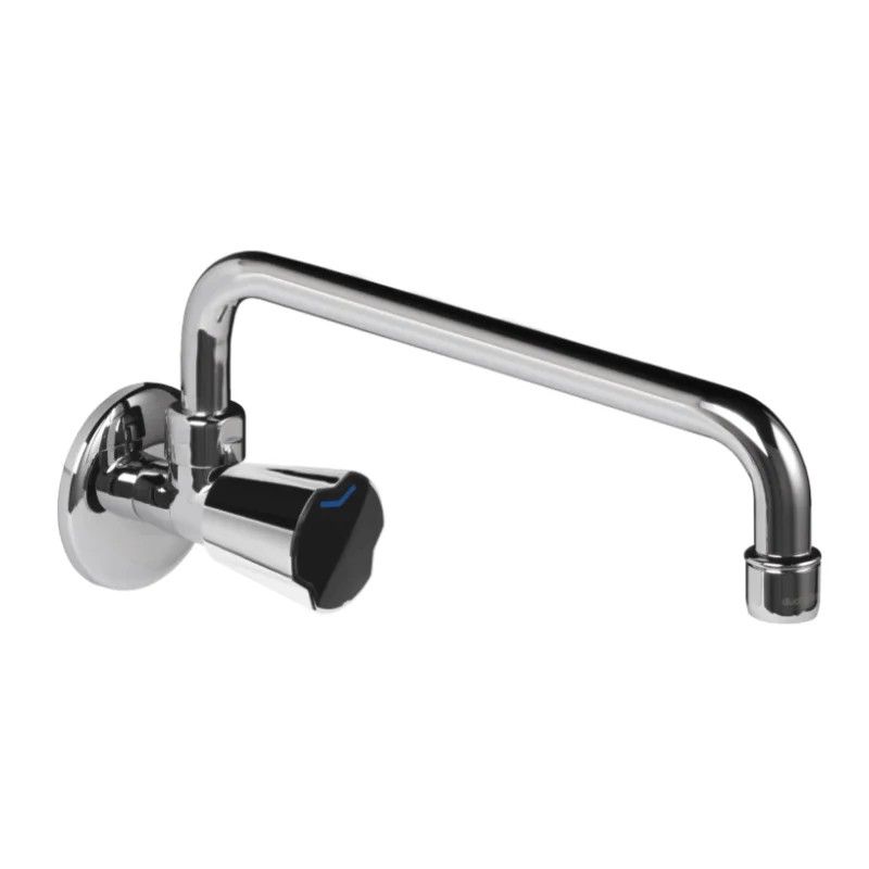 Grifo mural para conexión a pared de 1/2" de una sola agua, con caño superior pero muy plano, un poco más corto de lo habitual. El grifo tiene montura cerámica, para mejor apertura y cierre.